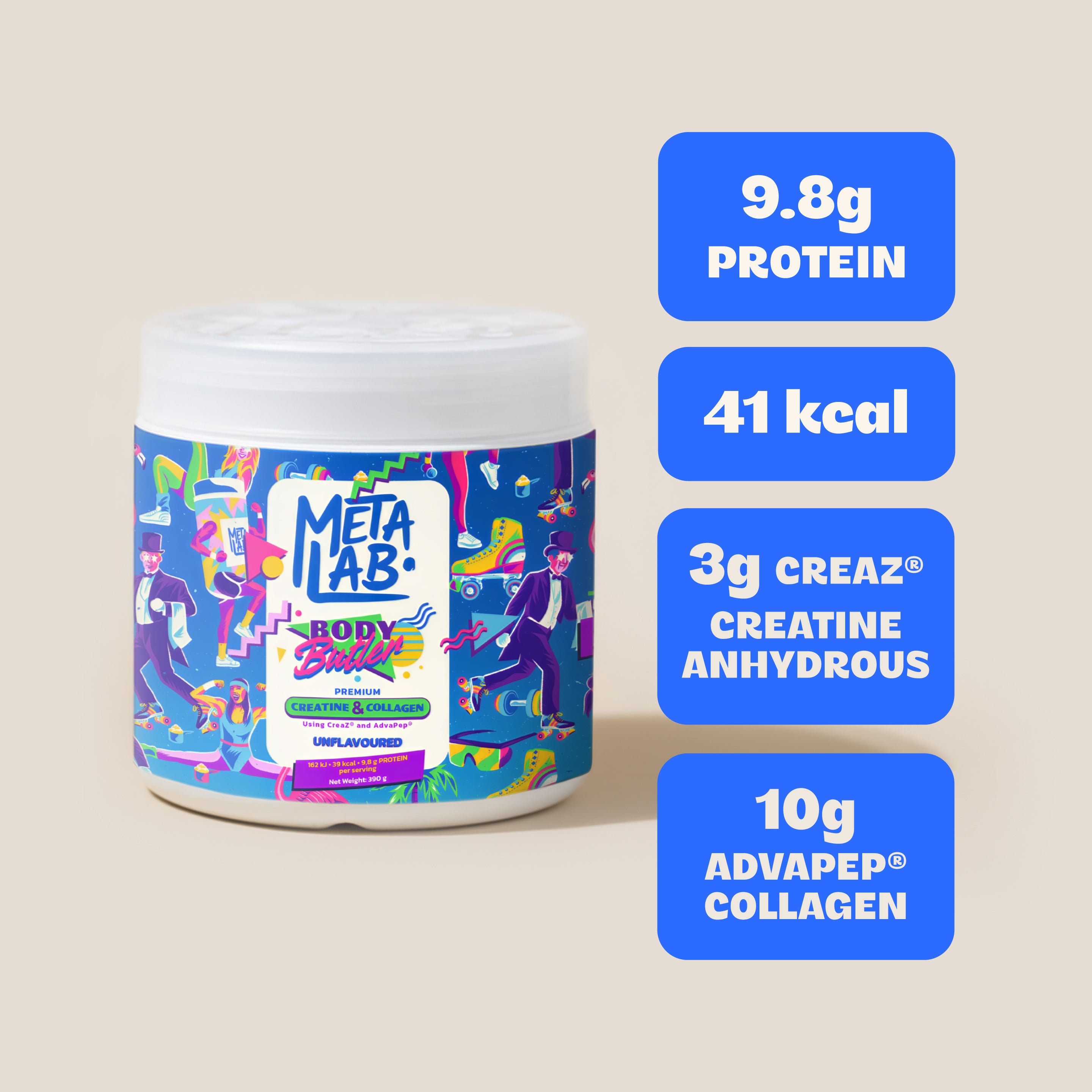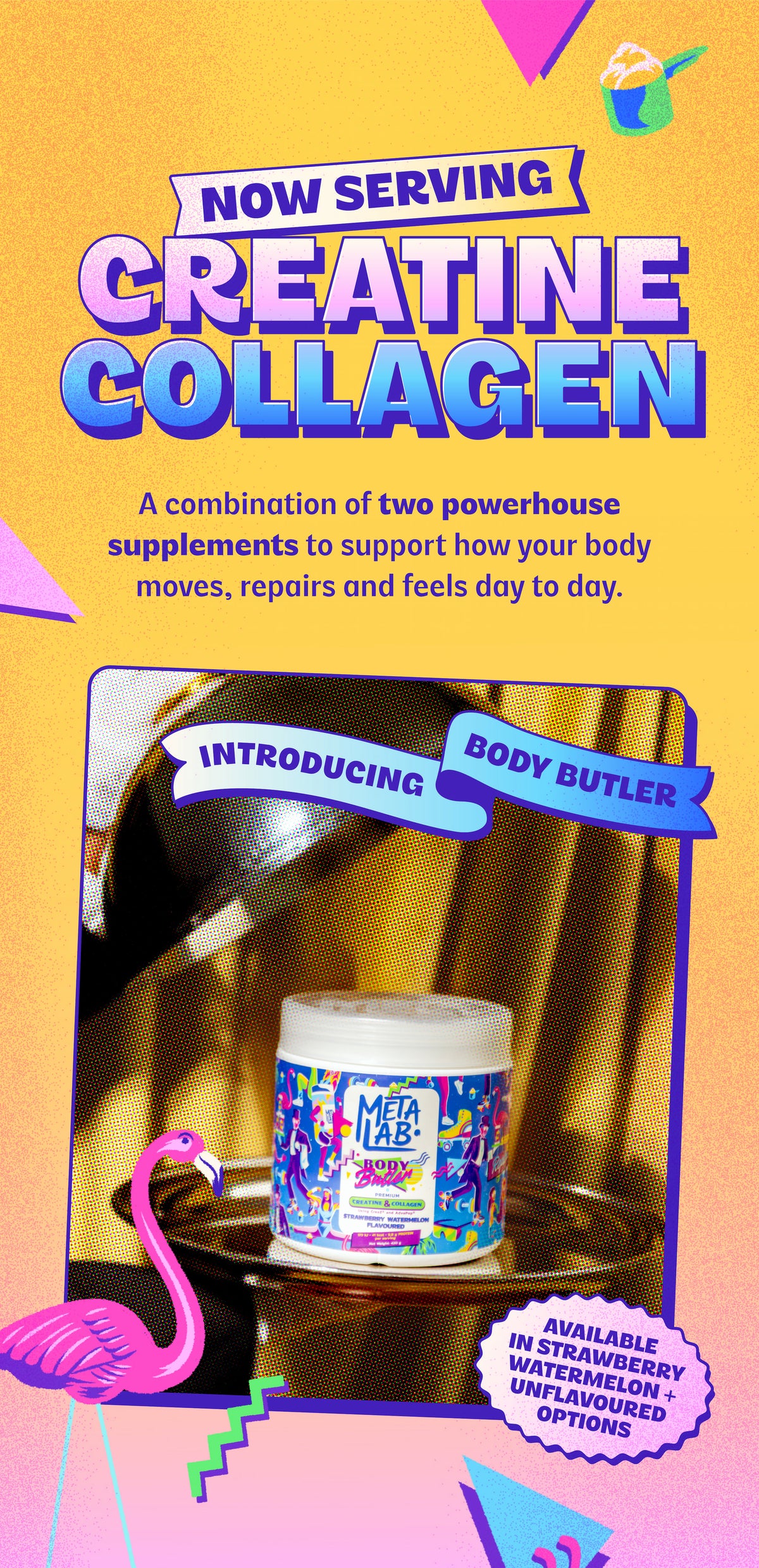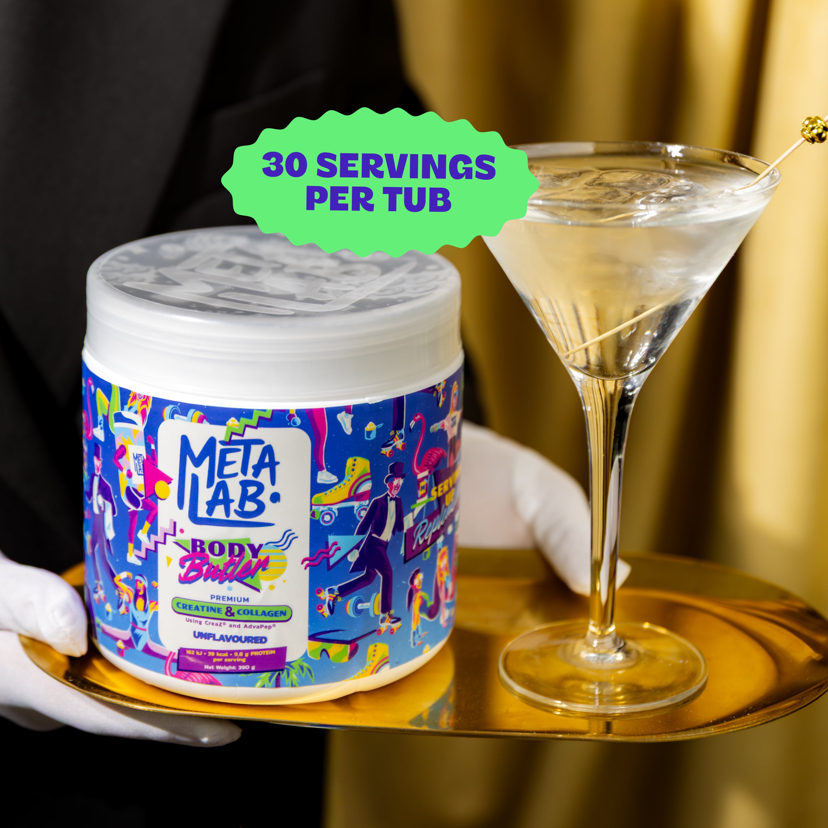 • Body Butler is a daily creatine and collagen supplement designed to support how your body feels, functions and holds up over time. Two proven ingredients, one simple scoop.
