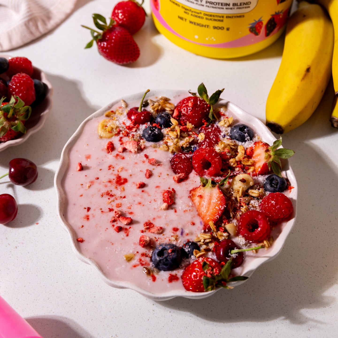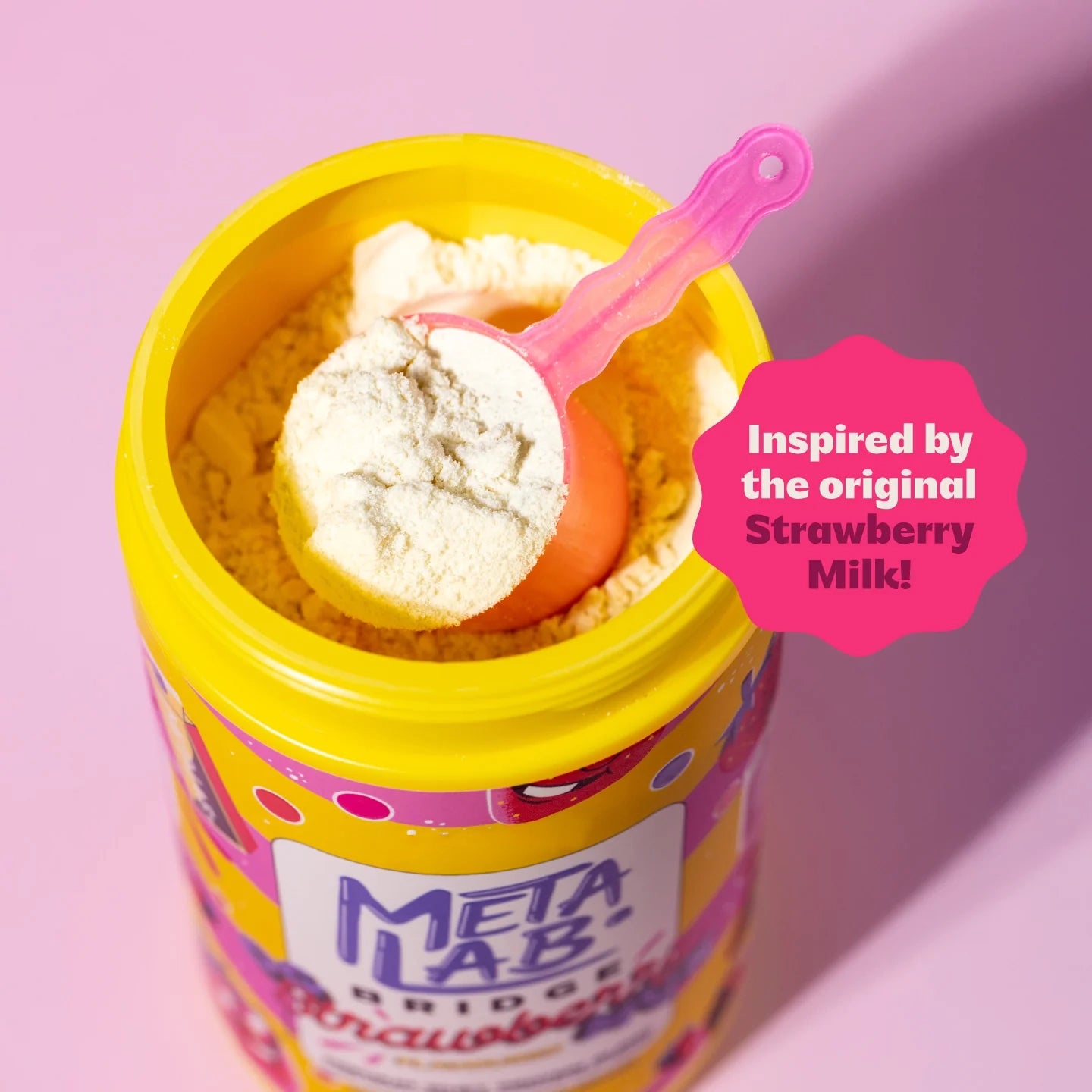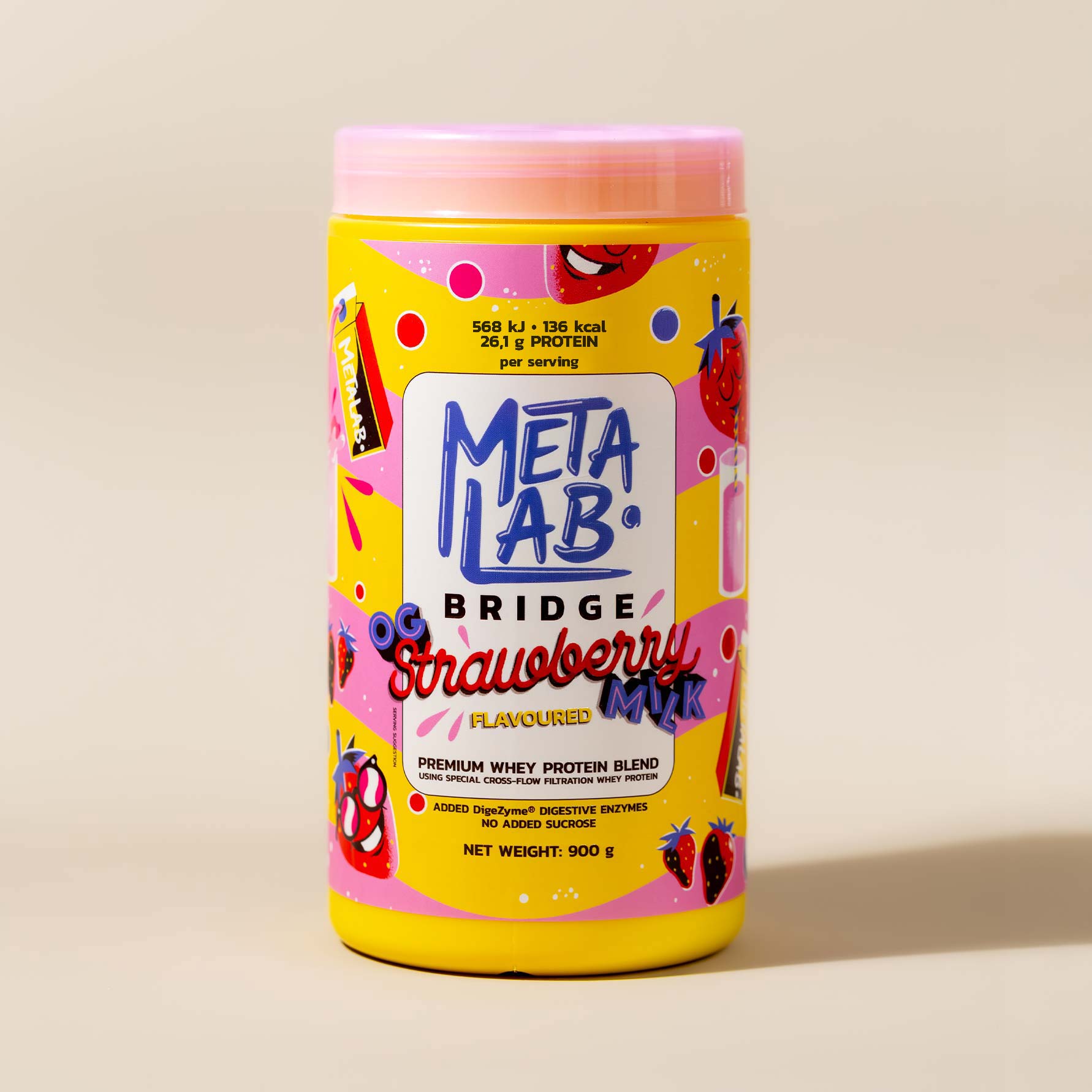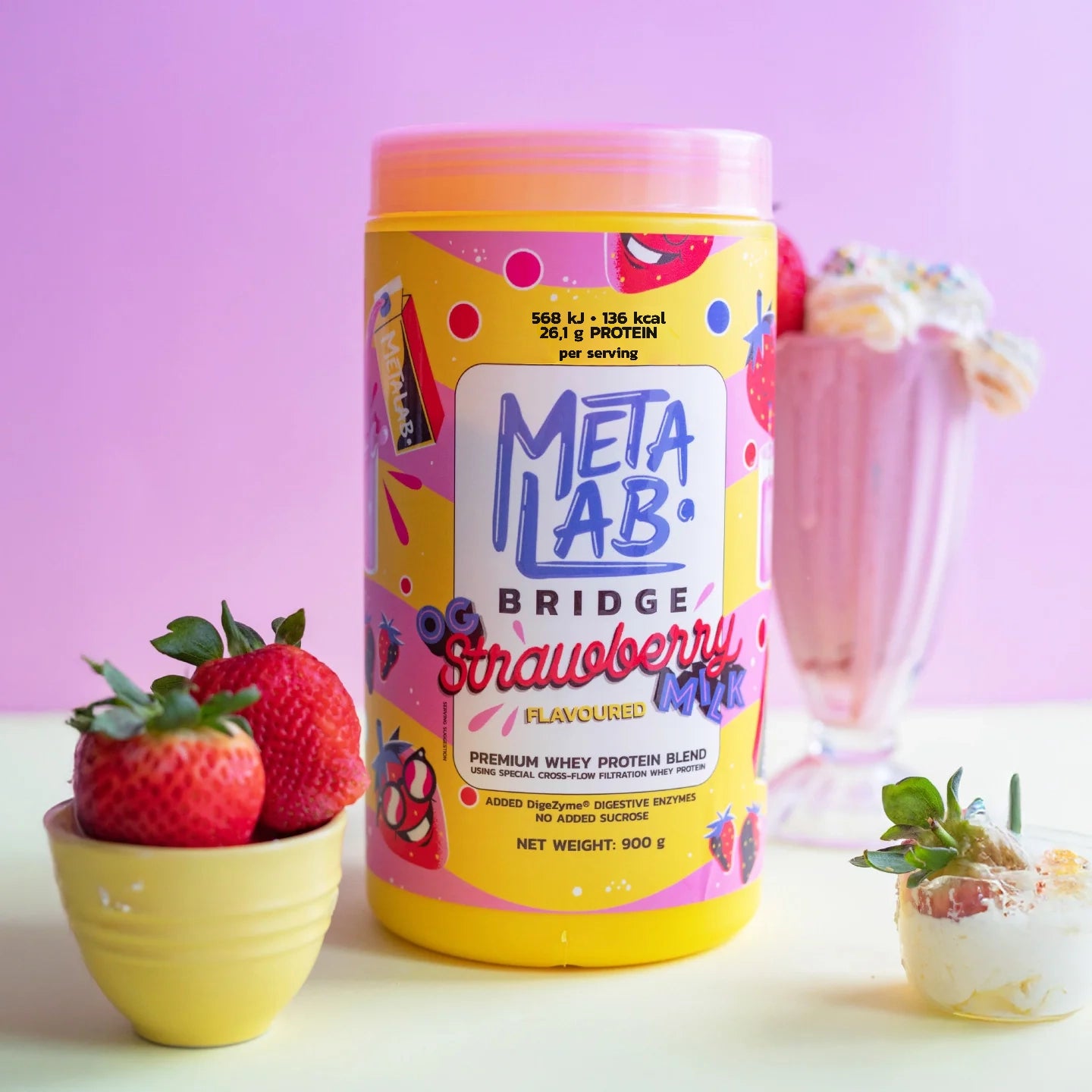 Whey Protein Concentrate, Whey Protein Isolate, Skim Milk Powder, Freeze-Dried Strawberry Powder (3.3%), Flavourings, Stabiliser (Xanthan Gum), Pink Himalayan Salt, DigeZyme® (Multi-Enzyme Complex), Non-Nutritive Sweetener (Sucralose). Our proteins are blended with our one-of-a-kind method, giving you that signature METALAB vibe... it's like a little magic in every scoop.